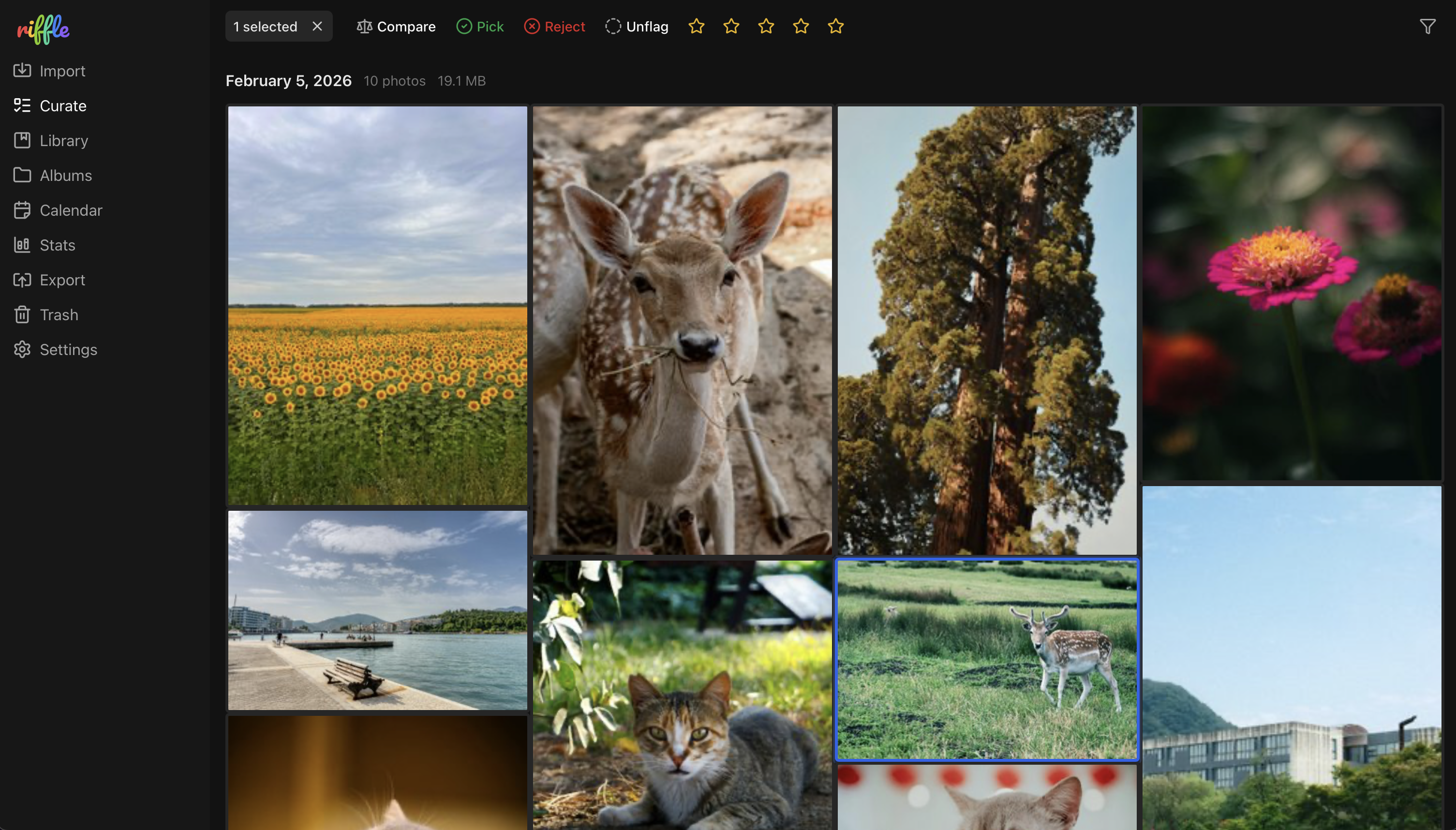 A keyboard-driven photo curating tool for photographers. Import from your camera, review and rate with lightning-fast shortcuts, then export only your picks to your library of choice.